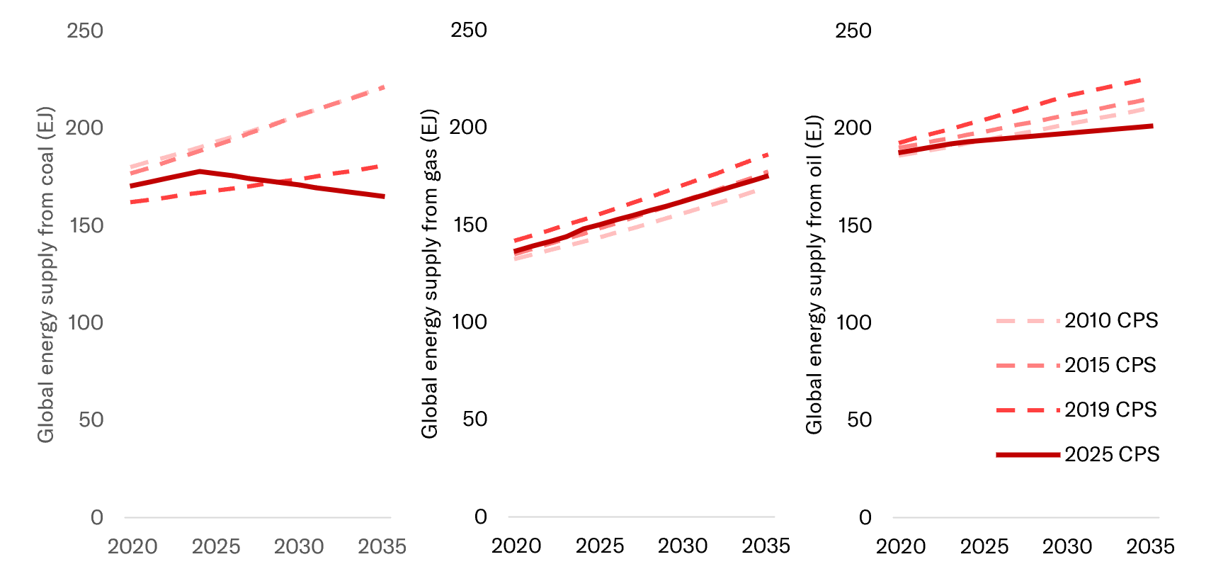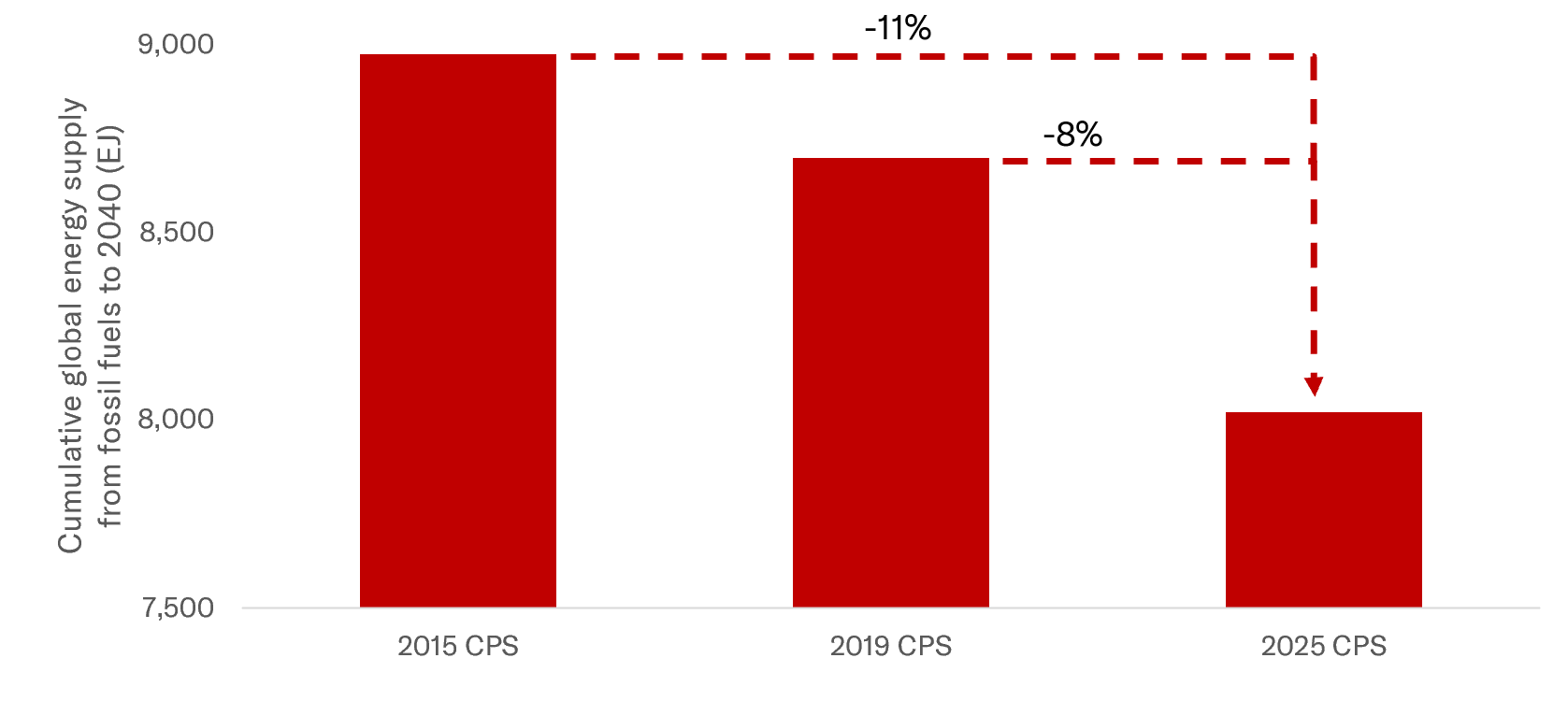Our analysis of the CPS over time shows that enacted policies have continued to evolve and place a longer-term downward pressure on fossil energy. In the 2025 CPS, cumulative energy supply from fossil fuels to 2040 is 11% lower than in the 2015 CPS, and 8% lower than the 2019 CPS – a trend likely to continue given technology and policy momentum.