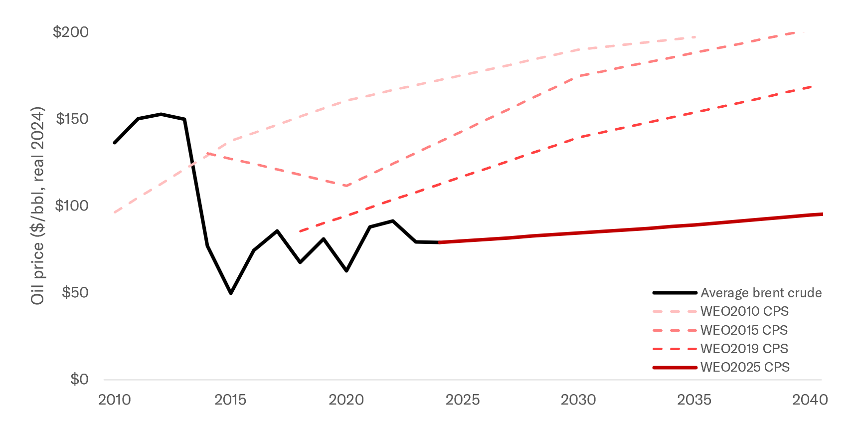Long-term, real[4] oil price expectations have declined across successive CPS editions, with the 2025 CPS projecting a materially lower path than prior iterations as demand growth tapers