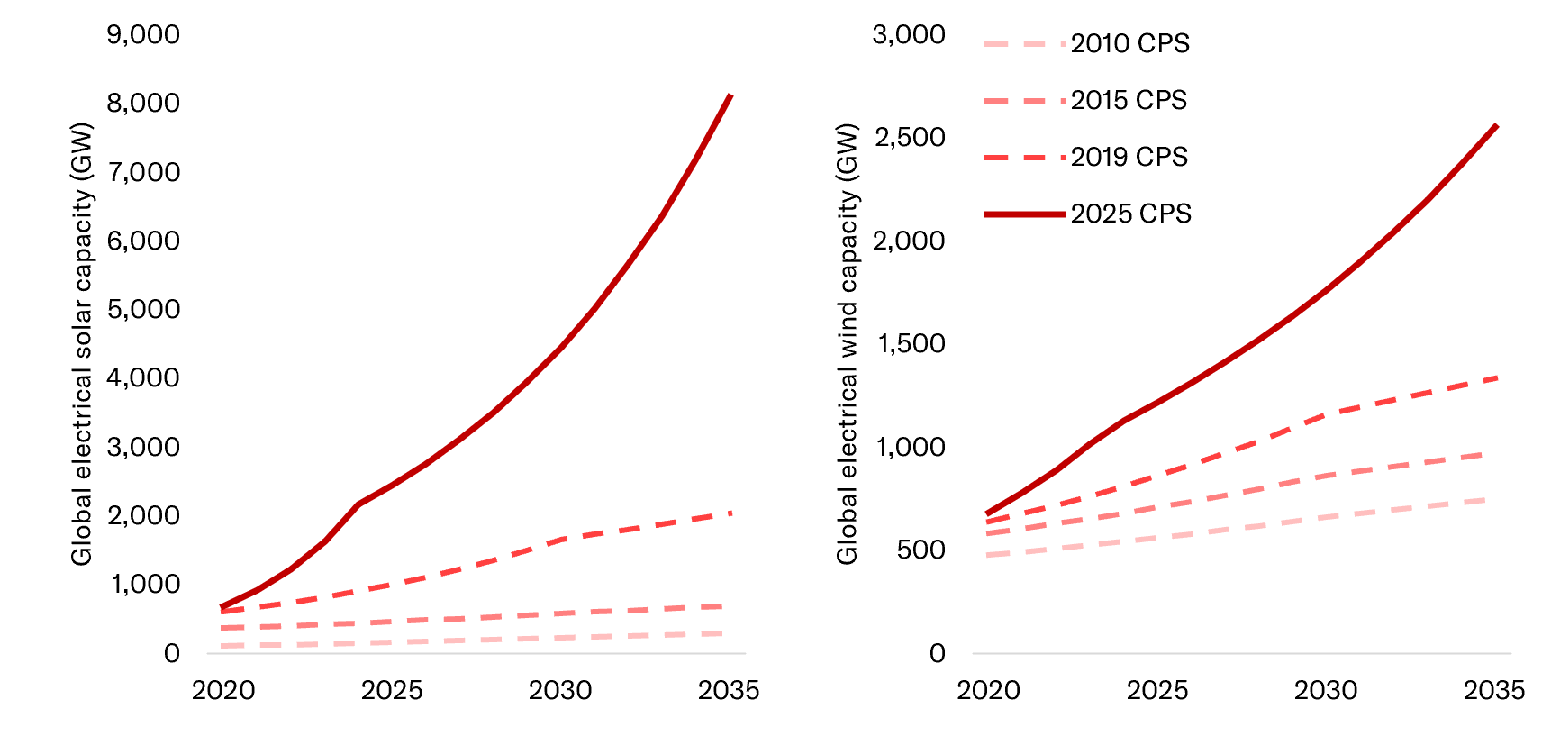 Solar (left) and wind (right) capacity sees an exponential rise in the 2025 CPS, which was not the case in previous editions
