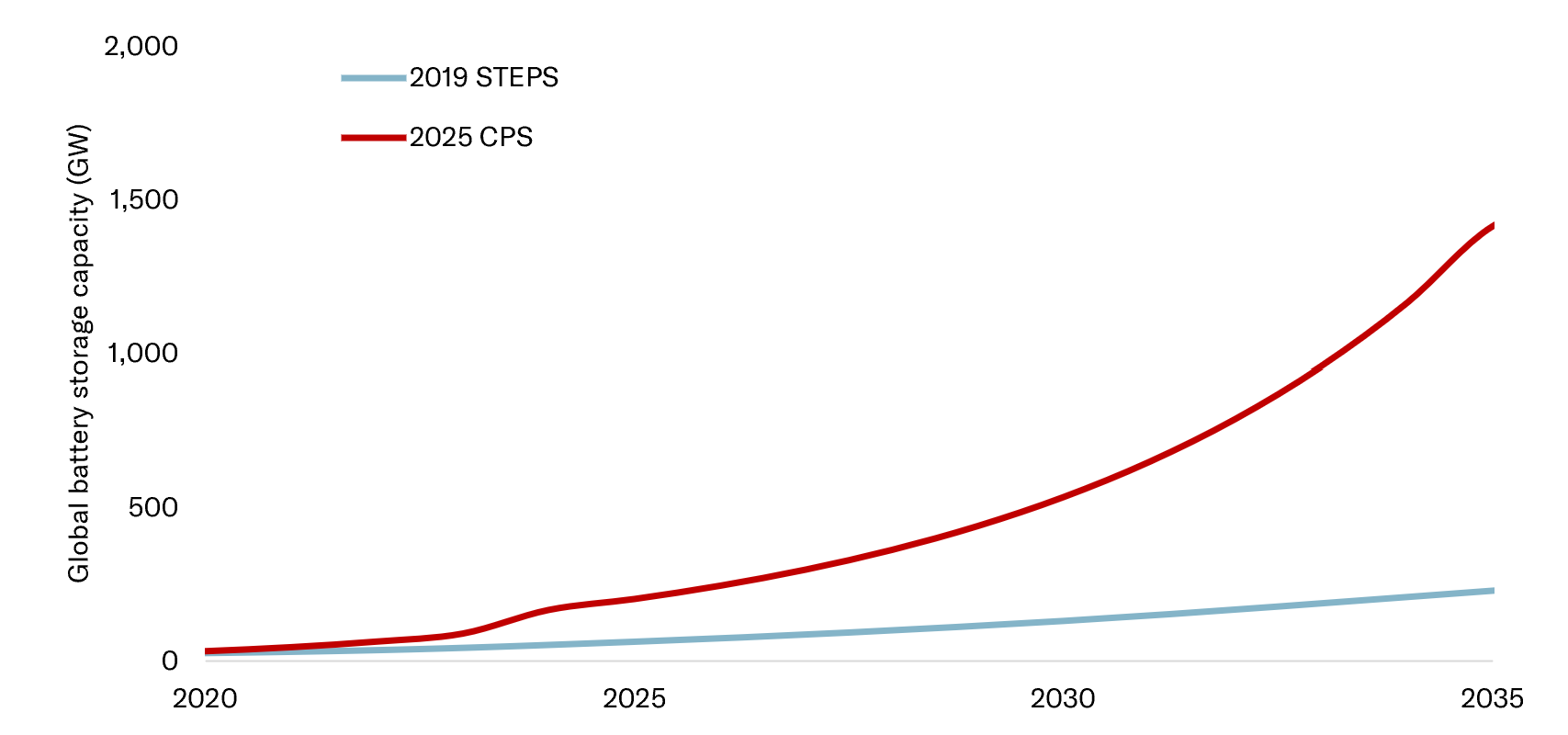 Battery storage has far outpaced earlier expectations, already reaching three times the level outlined in the 2019 STEPS[5] today. The 2025 CPS reinforces this trajectory, with storage levels projected to be about six times higher than the 2019 STEPS by 2035.