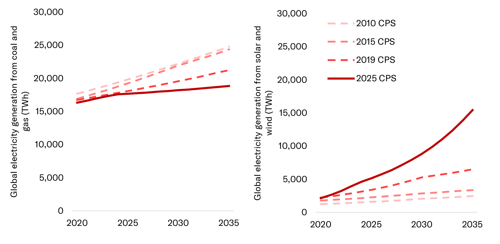 Electricity generation from coal and gas (left) is much lower in the 2025 CPS than previous editions and now faces significant risk of further displacement from wind and solar (right), which sees exponential grid penetration in the 2025 CPS relative to previous editions