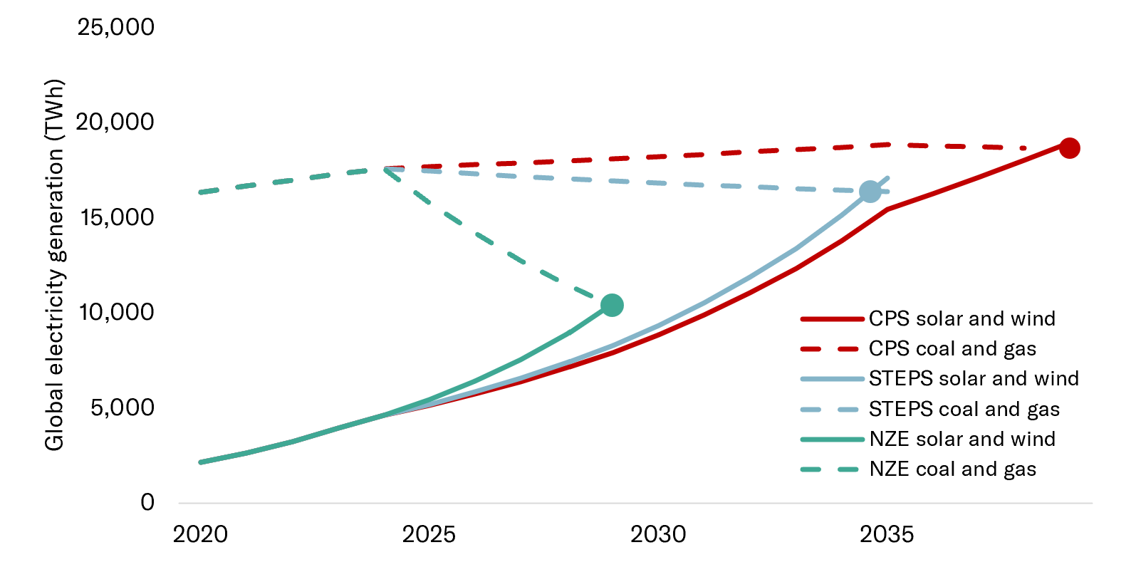 The point of intersection where solar and wind generation overtake coal and gas appears in the late 2030s in the 2025 CPS. This point is expected to move earlier as policies strengthen, yet it remains well behind the pace required in the NZE scenario